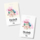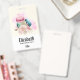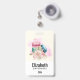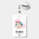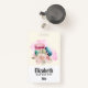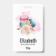 Personalized name badge with a delightful image. 3 colourful macarons, pink, green and blue with a fancy rose floral bouquet and a splash of pink watercolor behind. Delicious and stylish too! Light yellow background.