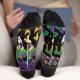 Mardi gras party socks patterned with carnival face masks, fleur de lys motifs and jester masks in purple, green and gold on black