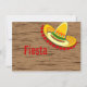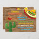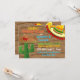 Fun couple's wedding shower invitation done in a colourful Mexican theme, with a brown wood grain looking background and graphics of a cartoon cactus wearing a sombrero and a decorative cartoon sombrero, on the top. Multi-coloured text is fully customizable and ready to personalize for your event.