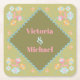 Colourful Mod Embroidery Coasters. Features hand drawn embroidery flowers in pretty pastel colours with green background and squiggle lines. Great folk art feel and perfect for a boho, modern, bold coloured, fiesta, garden or artisty couple. Hand drawn illustration by McBooboos. All wording can be changed to fit your needs. To make more changes go to Personalize this template. On the bottom you’ll see “Want to customize this design even further? Click on the EDIT using Design tool. From there you can change some of the fonts & some colours, move things around or delete what you need.