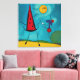 A whimsical, highly colourful abstract painting featuring something resembling a red, pointed, walking hat, a yellow sun with personality and a blue, walking dog in a baseball cap against a blue background and yellow ground., printed on canvas. Available in various sizes.