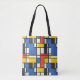 An abstract, geometric, and brightly coloured print in blue, yellow, red, and black squares, rectangles and lines creates a tote bag that you will love to carry anywhere!. Reminiscent of Piet Mondrian's style, this is a retro look with a modern update that's sure to please!