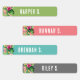 These skinny iron-on labels are great for kids and adults for quickly identifying whose stuff it is. Easily add to clothing and accessories for camping, travel, school and other events. Four different colours with tropical leaves bouquet and customizable white text allows you to add up to 4 different names, or make them all the same. Background and text colours can also be easily changed. Great for employees too!
