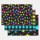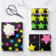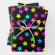 Colourful teal, yellow, pink, purple, and blue neon stars on black gift wrapping sheet set.