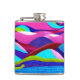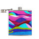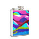 Colourful abstract landscape of hills and an ocean in colours of pink, purple, blue, green, and cyan.