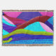 Colourful abstract landscape of hills and an ocean in colours of pink, purple, blue, green, and cyan.
