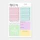 Colourful organized day post-it notepad with your name in a brush script, to do lists, waterdrops to fill in as you hydrate throughout the day, place to jot down your daily meals, appointments to make or people to contact, and notes. Personalized your day post-it notepad in a multi colour design.