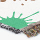 White background with black, blue, red, green, orange and brown paint splatters pattern.