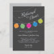 Modern wedding rehearsal dinner invitation features a night sky with vibrant and colourful hanging paper lanterns. Charcoal black background with light grey, orange, green, magenta pink, blue, and lime green colours.