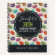 Personalized birthday party guest book with a cute pattern of macarons in many different colours with a faint polka dot pattern behind. A black circle with your personalized text inside layered over top the pattern.
