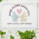 This design features silhouettes of bunnies (blue & yellow, pink & green) and a heart. The simple animal design with personalized text makes a cute modern and unique kitchen towel - SOME BUNNY LOVES YOU | HAPPY EASTER, HAPPY SPRING!