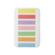 Geometric linear, rectangle, striped pattern of rainbow pastel hues of blue, orange, green, pink, purple, red and yellow.