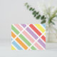 Geometric linear, rectangle, striped pattern of rainbow pastel hues of blue, orange, green, pink, purple, red and yellow.