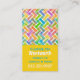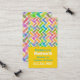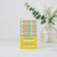 Modern, colourful mommy networking business card, done in a vertical style, with a yellow background. Graphics of colourful layers of a chevron pattern, decorates the top, of the card, with green and white custom text, below, ready to personalize. Great card to hand out to other mothers for arranging baby sitting, play dates, parties and more.