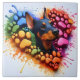 A vibrant tile showcases a Dobermann dog's head surrounded by an explosion of colourful paw prints. The playful design captures the essence of joy and creativity, symbolizing the bond between humans and their furry friends in an imaginative setting.
