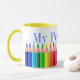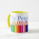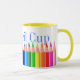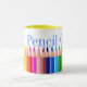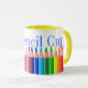 Great for kids, teachers, or anyone's desk, this colourful mug has graphics of coloured pencils lined up, all around the mug. Blue text reads My Pencil Cup. Makes a nice teacher's gift, mother's day gift, or a special gift for your favourite child, just add pencils or crayons for a sweet gift.