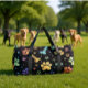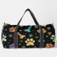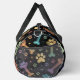This unique duffle bag features a bold black background adorned with a colourful pattern of coloured paw prints and bones in various vibrant hues. It's a cute design pet accessory and functional travel carrier for any pet lover.