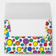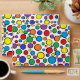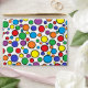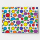 Abstract art of polka dots of different colours outlined in black against a white background.