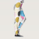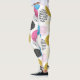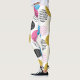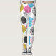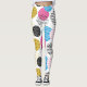 A pair of leggings with a pattern of colourful circles and lines, the circles are pink, blue, yellow, and black, and white.