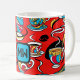 This coffee mug features a vibrant and playful design centred on colourful teacups and coffee cups in swirling, abstract patterns. The bold red background contrasts beautifully with shades of blue, yellow, and black, creating a striking visual impact. The large, customizable monogram (currently shown as “MW”) is prominently displayed in a light blue square with black text, adding a personal touch. Ideal for coffee or tea lovers, this mug is both functional and stylish, perfect for gifting or adding a pop of personality to your daily routine. Replace the initials in the monogram with your own preferred initials.