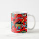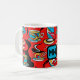 This coffee mug features a vibrant and playful design centred on colourful teacups and coffee cups in swirling, abstract patterns. The bold red background contrasts beautifully with shades of blue, yellow, and black, creating a striking visual impact. The large, customizable monogram (currently shown as “MW”) is prominently displayed in a light blue square with black text, adding a personal touch. Ideal for coffee or tea lovers, this mug is both functional and stylish, perfect for gifting or adding a pop of personality to your daily routine. Replace the initials in the monogram with your own preferred initials.