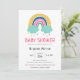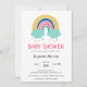 Cute illustrated colourful rainbow, baby shower invitation. Template allows all text to be customized. Back of card features coordinating pink and white doodle pattern.