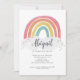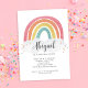 Colourful Rainbow Kids Birthday Invitation invitation features a hand drawn rainbow in shades of pink, orange, yellow and turquoise and a trendy calligraphy name.