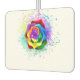 Large, blooming rose with rainbow petals on white background, painted over with splashes of colourful, bright paint. 3d