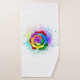 Large, blooming rose with rainbow petals on white background, painted over with splashes of colourful, bright paint. 3d