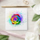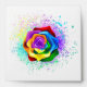 Large, blooming rose with rainbow petals on white background, painted over with splashes of colourful, bright paint. 3d