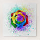 Large, blooming rose with rainbow petals on white background, painted over with splashes of colourful, bright paint. 3d