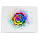 Large, blooming rose with rainbow petals on white background, painted over with splashes of colourful, bright paint. 3d