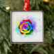 Large, blooming rose with rainbow petals on white background, painted over with splashes of colourful, bright paint. 3d