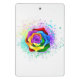 Large, blooming rose with rainbow petals on white background, painted over with splashes of colourful, bright paint. 3d