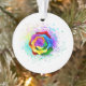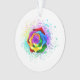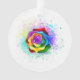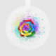 Large, blooming rose with rainbow petals on white background, painted over with splashes of colourful, bright paint. 3d