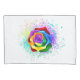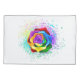 Large, blooming rose with rainbow petals on white background, painted over with splashes of colourful, bright paint. 3d