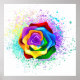 Large, blooming rose with rainbow petals on white background, painted over with splashes of colourful, bright paint. 3d