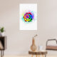 Large, blooming rose with rainbow petals on white background, painted over with splashes of colourful, bright paint. 3d
