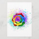Large, blooming rose with rainbow petals on white background, painted over with splashes of colourful, bright paint. 3d
