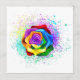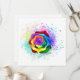 Large, blooming rose with rainbow petals on white background, painted over with splashes of colourful, bright paint. 3d