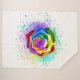 Large, blooming rose with rainbow petals on white background, painted over with splashes of colourful, bright paint. 3d