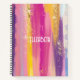 A personalized spiral notebook with an abstract background design. Vibrant stripes in both bold and pastel colours. Pinks, blues, purples and yellow colours combined with faux gold sparkly glitter layered over top.
