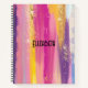 A personalized spiral notebook with an abstract background design. Vibrant stripes in both bold and pastel colours. Pinks, blues, purples and yellow colours combined with faux gold sparkly glitter layered over top.