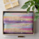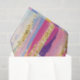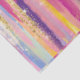 Tissue paper with an abstract background design. Vibrant stripes in both bold and pastel colours. Pinks, blues, purples and yellow colours combined with faux gold sparkly glitter layered over top.