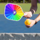 This modern pickleball paddle design features a colourful rainbow sun background, with your initial in bold white text for a look that is simple and stylish, yet professional.