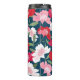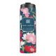 Beautiful and colourful illustrated floral business thermal tumbler with company qr code and business name. Pretty tumbler features a lovely pink red and white floral and greenery pattern on a blue background.