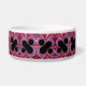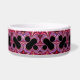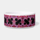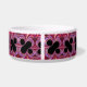 This pet bowl features a beautiful fractal art with black percent sign on an abstract red, pink, and purple background.