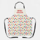 Get ready for holiday meal prep in cozy, nostalgic style with this beautifully designed apron, featuring a soft, warm cream background! The pattern is a colourful celebration of classic Christmas style, showcasing an array of retro ornaments (baubles, stars, bells, and Christmas trees) in vibrant red, blue, yellow, and green, all linked by a bright red beaded garland.