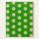 A colourful classic coach camper, sporting vibrant turquoise blue, lime green, tangerine orange, and pink, sits against a cheerful mod flower background. The retro floral background is avocado green, lime green, bright pink, violet, and lilac. There is a template on the front where you can add a name or other text. The cute retro floral pattern is also on the back of the planner. This could be a fun travel log, especially for someone who loves road trips or camping.