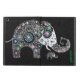 Colourful flowers arranged in shape of an elephant with diamond studs. Not real diamonds just an image. Black floral damasks pattern. One of 4 variations on this elephant design.